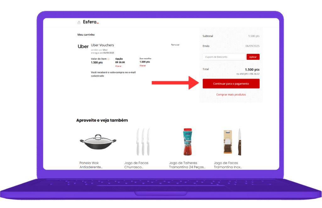 6. Confirme o Resgate: Revise os detalhes do seu pedido no carrinho e confirme em Continuar para pagamento. A quantidade de pontos necessária será debitada do seu saldo.