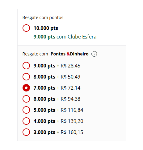 Com a função Pontos + Dinheiro, a Esfera permite que você cubra esses 2.000 pontos faltantes pagando um valor em reais. Neste exemplo, o custo poderia ser de aproximadamente R$ 72,14.
