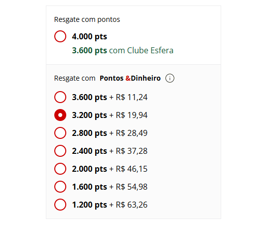 Em vez de ter que esperar juntar os 800 pontos restantes, a função Pontos + Dinheiro permite que você complete o valor na hora. Nesse cenário, você pagaria apenas R$ 19,94 para cobrir a diferença.
