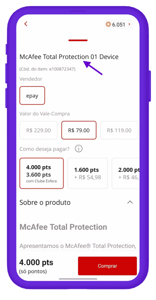 No exemplo abaixo mostra que o valor para o McAfee Total Protection para 1 dispositivo é de R$79,00 e custa a partir de 3.600 pontos. Depois, é só ir em “Comprar”.