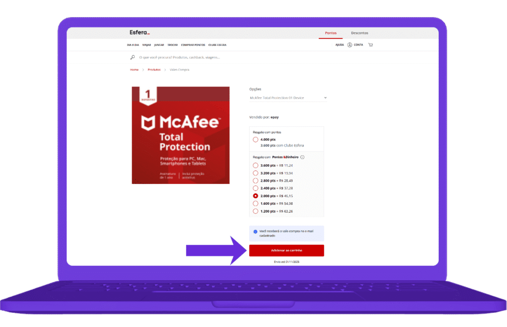 Quanto custa para comprar vale-compra McAfee com pontos Esfera?