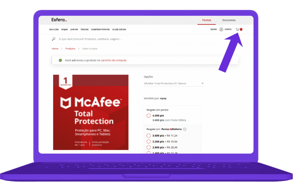 Uma das funcionalidades mais úteis da Esfera é a opção pontos e dinheiro. Se você encontrou o produto McAfee que deseja, mas seu saldo não é suficiente, não se preocupe.