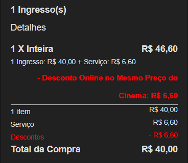 As entradas “Inteira” no cinema geralmente têm um custo mais elevado. Como no exemplo abaixo, um único ingresso Cine A pode custar até R$ 40,00.