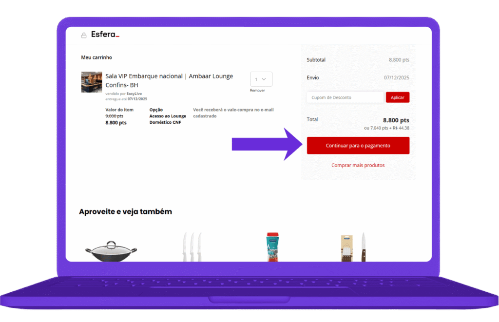 6. Use a régua para ajustar quanto quer gastar em pontos e o restante no cartão. Revise o resumo da compra e conclua a operação.