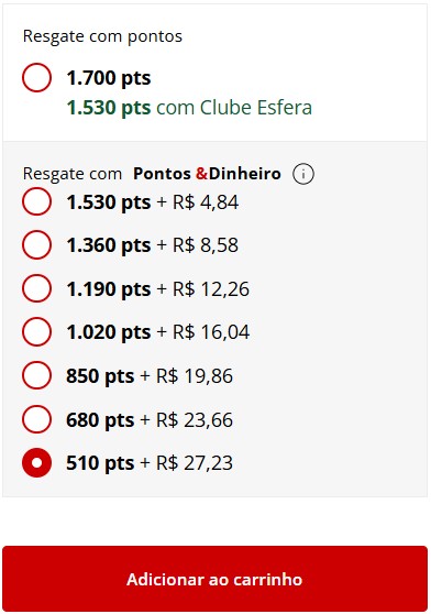 Ainda que seja possível fazer o resgate utilizando somente os pontos acumulados, você também pode resgatar seu voucher economizando sua pontuação e dinheiro.