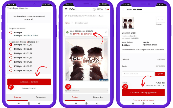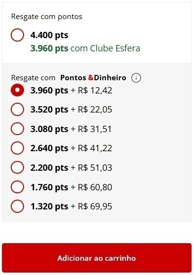 Entretanto, com a Esfera você pode combinar seus pontos com um pequeno pagamento em dinheiro, tendo a possibilidade de pagar muito menos pela sua aquisição. Veja um exemplo a seguir: