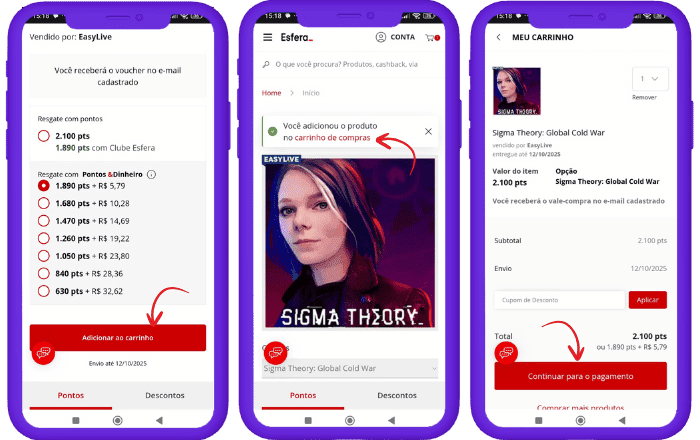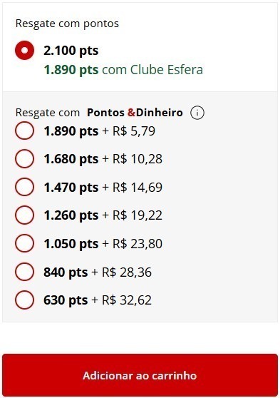 O resgate dos produtos e demais benefícios disponíveis na Esfera pode ser feito utilizando apenas a pontuação acumulada ao longo do tempo ou combinando uma parte dos seus pontos com um pagamento em dinheiro.