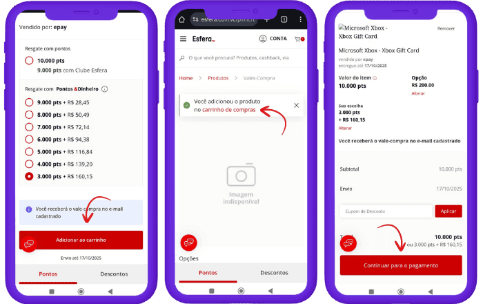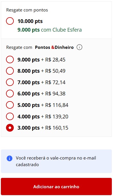 Além disso, quem faz parte do Clube Esfera tem desconto de 10% no resgate de vouchers. Portanto, os pontos faltantes custam apenas R$ 144,13 gerando uma economia de 27,93%!