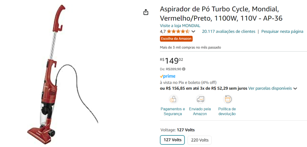 Digamos que você esteja pensando em comprar um aspirador de pó vertical, como o da foto abaixo, mas antes deseja saber o quanto o aparelho vai gastar por mês.