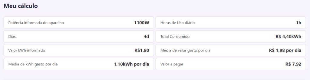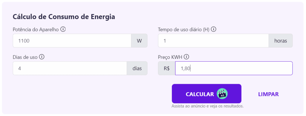 Sabendo que a potência do aparelho, informada pelo próprio site, é de 1100W, e que o preço do kWh, conforme informações da prestadora local, é de R$ 1,80, é hora de preencher os dados na calculadora de energia.