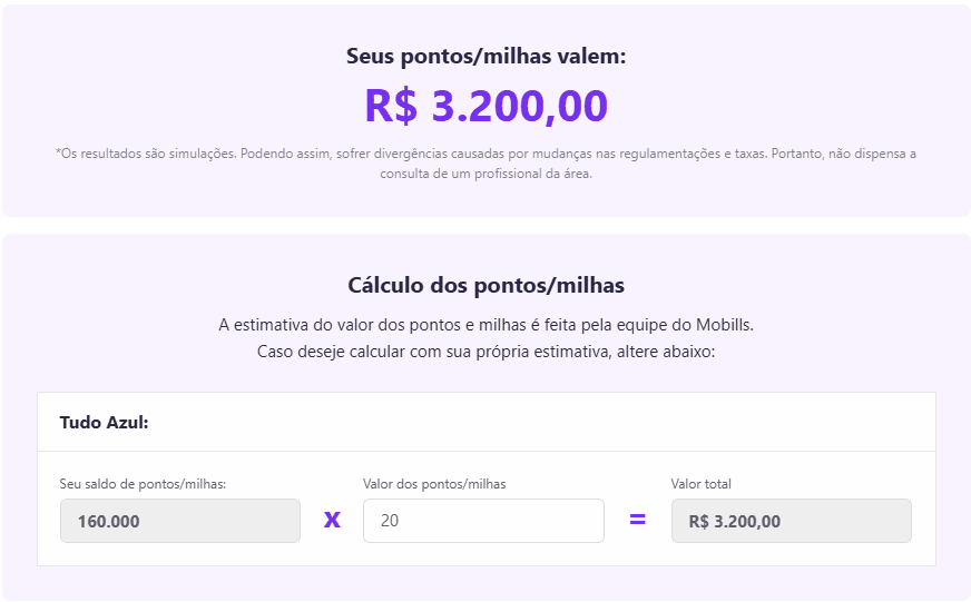 Vale destacar que a avaliação do valor dos pontos e milhas para essa calculadora é feita por nossa equipe.