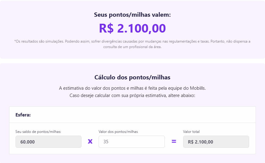 Para deixar mais claro, veja abaixo um exemplo da nossa calculadora: Quanto vale 60.000 pontos Esfera e 160.000 milhas Azul?
