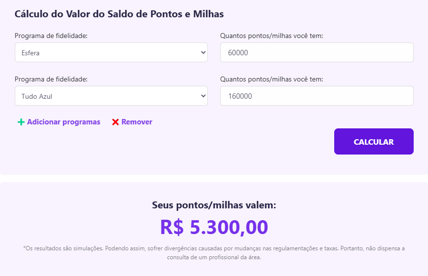 Para isso, nossa calculadora multiplica a quantidade de pontos e milhas que você possui em um determinado programa e pelo valor de ponto/milha do programa informado.