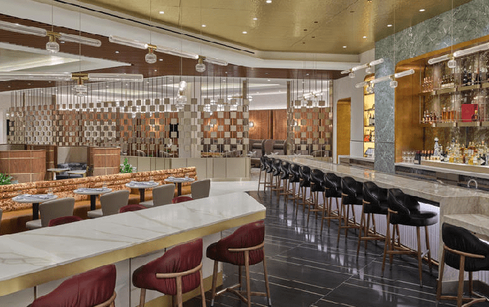 No Icon Bar, é possível ver os tons do pôr do sol, completados por detalhes de couro e nogueira. Já a leveza da costa é refletida no bar Verde Emerald, com toques de quartzito e ônix.