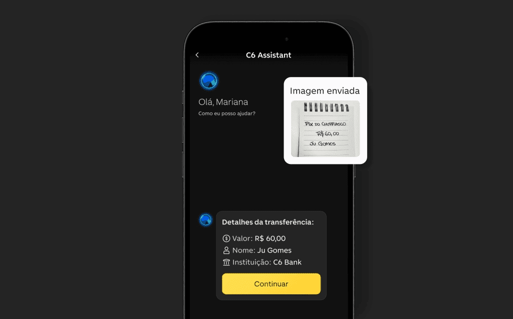 Dessa forma, você pode, por exemplo, enviar uma imagem com os dados do Pix que o C6 Assistant irá preencher tudo para fazer a transferência com rapidez direto da sua conta C6 Bank.