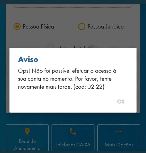 Ao encontrar o app Caixa fora do ar e/ou com instabilidades, é recomendado tentar o acesso à instituição financeira por meio do Internet Banking, no navegador, ou buscar atendimento em uma agência física.
