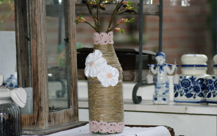 Envolva garrafas de vidro com barbante e coloque flores para criar um belo centro de mesa;