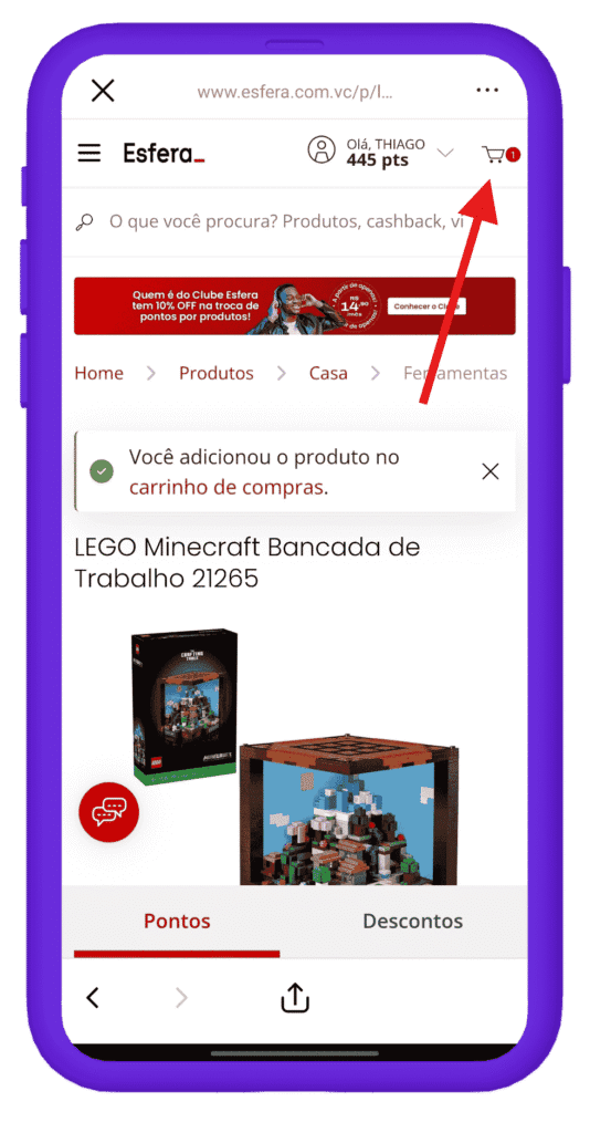 3. Ao escolher o item, selecione se deseja resgatar só com pontos ou com a opção pontos + dinheiro e adicione ao carrinho.