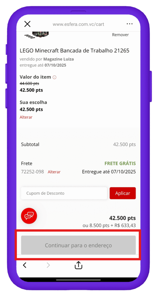 5. Depois de revisar o valor total e aplicar o cupom de desconto (se houver), vá para o endereço.