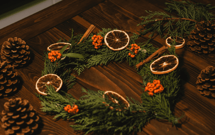 Galhos secos, flores e frutas natalinas também adicionam um toque rústico e encantador. Além disso, pode mesclar com itens que você já tem, como bolas de Natal, velas e festões.