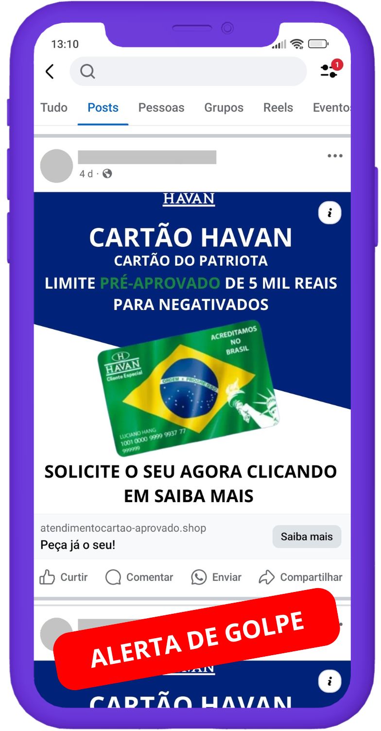 Este golpe de cartão de crédito é divulgado em perfis falsos nas redes sociais onde o cartão da Havan é oferecido com alto limite para negativados, desde que o cliente pague uma taxa.