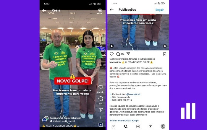 Em perfil oficial no Instagram @havanoficial, Luciano Hang e uma funcionária fazem alerta aos seus clientes para que não acreditem em perfis não oficiais e não forneçam dados pessoais em sites que não sejam o havan.com.br.