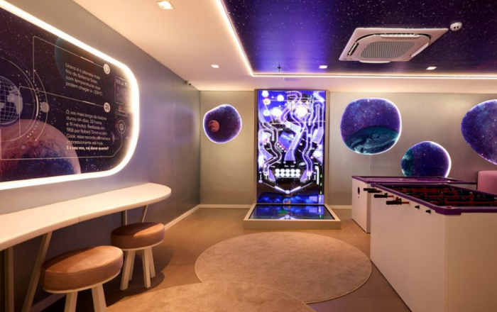 No subsolo da sala VIP Nubank em Guarulhos, os clientes encontram um espaço aconchegante, uma sala de jogos para crianças, sala de amamentação, trocador e banheiro infantil.
