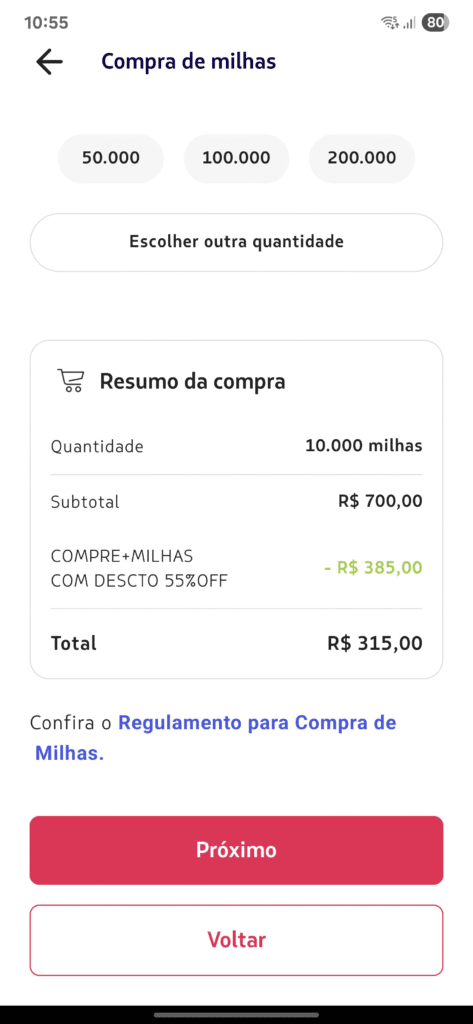 Selecione a quantidade de milhas a serem compradas e vá em “Próximo”.