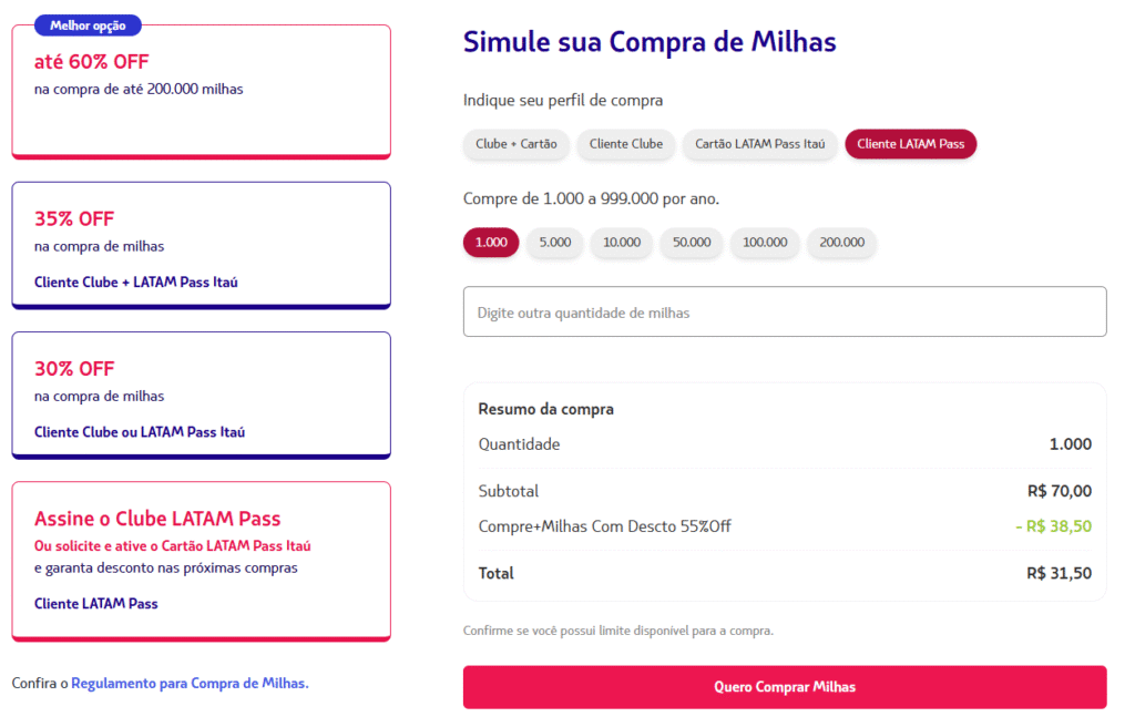 Já no caso dos demais clientes Latam Pass, o desconto é de 55%, então, o milheiro sai por R$31,50.