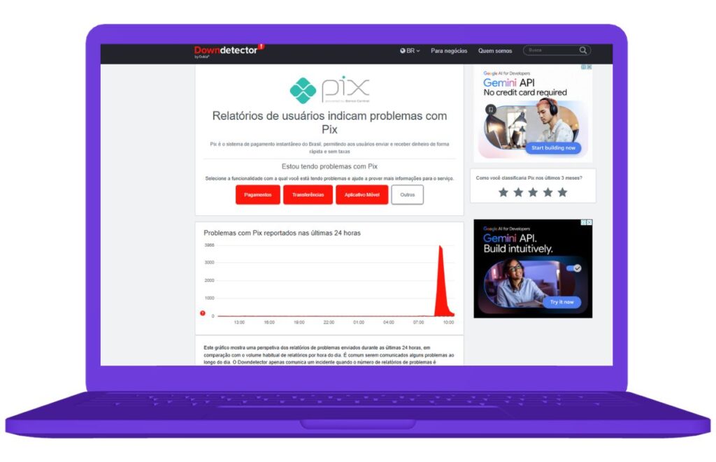 De acordo com o site Downdetector, que monitora instabilidades em serviços digitais, o pico de reclamações ocorreu às 9h10, com mais de 4.400 queixas registradas. A falha impactou tanto bancos tradicionais quanto digitais, gerando grande repercussão entre os usuários.