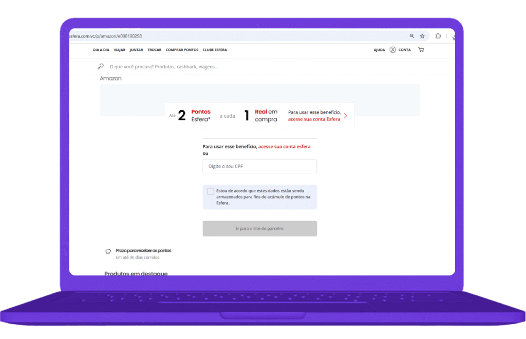 Os pontos são válidos por 36 meses. - Ganhe cashback, descontos e mais pontos com a Esfera: compre no shopping Esfera e receba parte do valor de volta. Aproveite descontos em parceiros, opções para juntar mais pontos e trocar por produtos, viagens, experiência, vales-compra e mais!