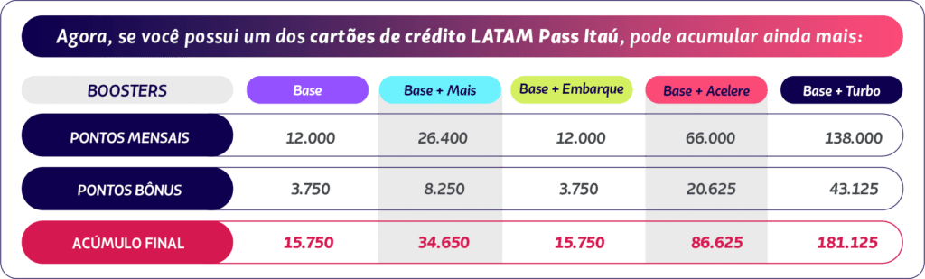 É importante ressaltar que, se você for titular de um cartão Itaú LATAM Pass, ganhará ainda mais pontos. Assim, o acúmulo anual de pontos bônus pode passar de até 43 mil.
