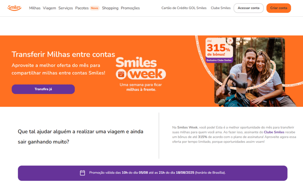 • Transfira milhas entre contas: Ganhe até 315% de bônus ao transferir milhas para outra conta Smiles.