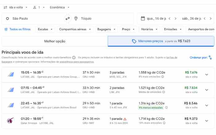 Até então, o Google Flights sempre destacava os melhores itinerários no topo da lista, levando em consideração várias características. Por exemplo, a duração da viagem e número de conexões.