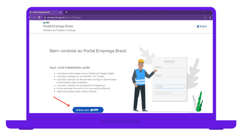 Passo 3 – Ao clicar, você será direcionado para o Portal Emprega Brasil e deve clicar no botão azul Entrar com gov.br;