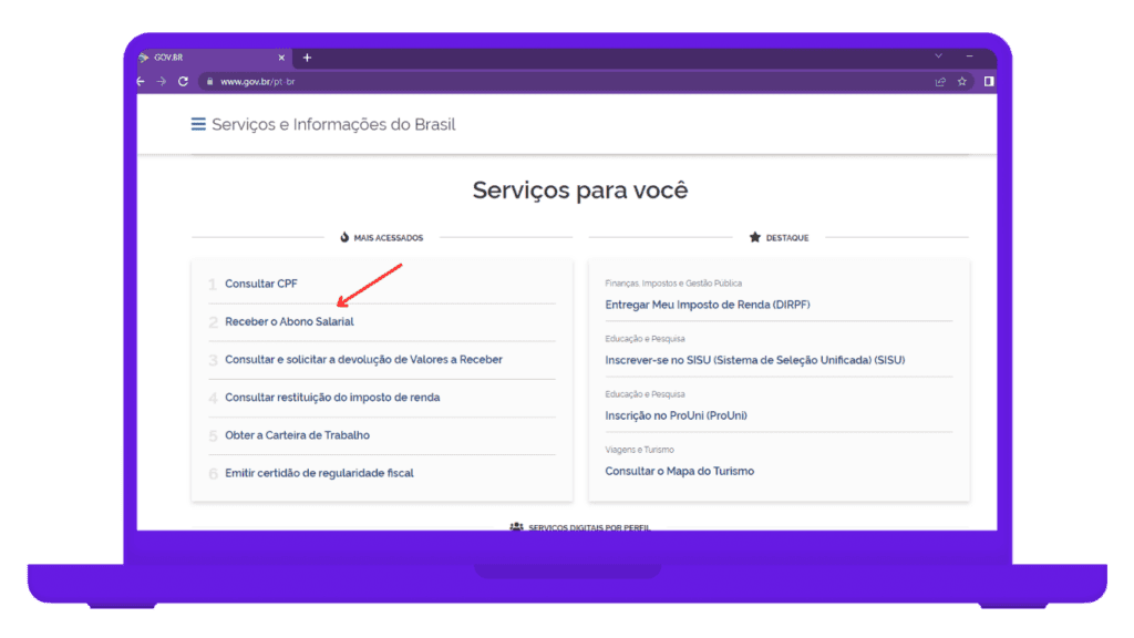 Passo 1 – Acesse o portal gov.br e clique no serviço Receber Abono Salarial. Para facilitar, você;